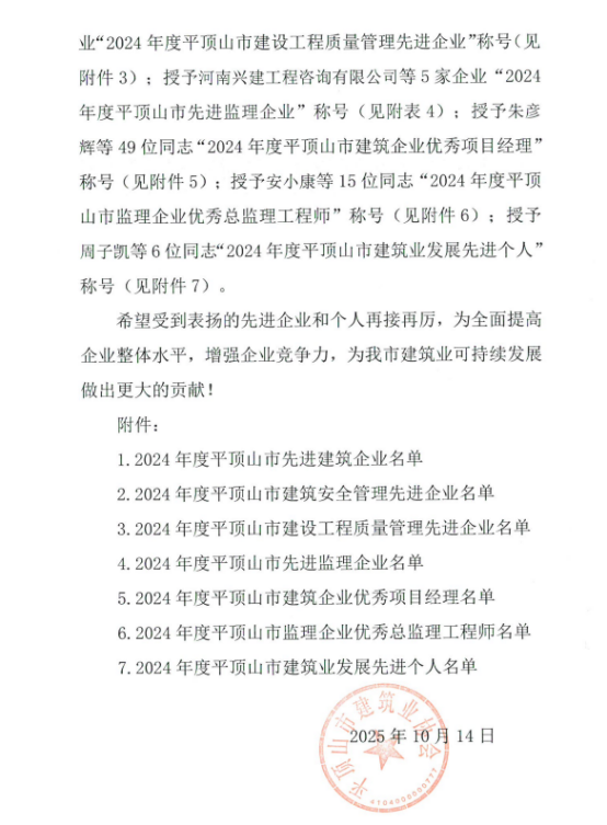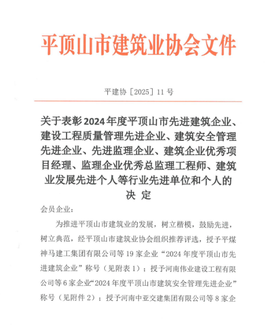 喜报传来!在平顶山市建筑业协会组织的 2024 年度行业评选中,河南金鹰建设集团有限公司武春晓、李凯等8位项目经理脱颖而出,荣获 “2024 年度平顶山市建筑企业优秀项目经理” 殊荣,个人专业素养与企业管理实力获行业权威认可。
