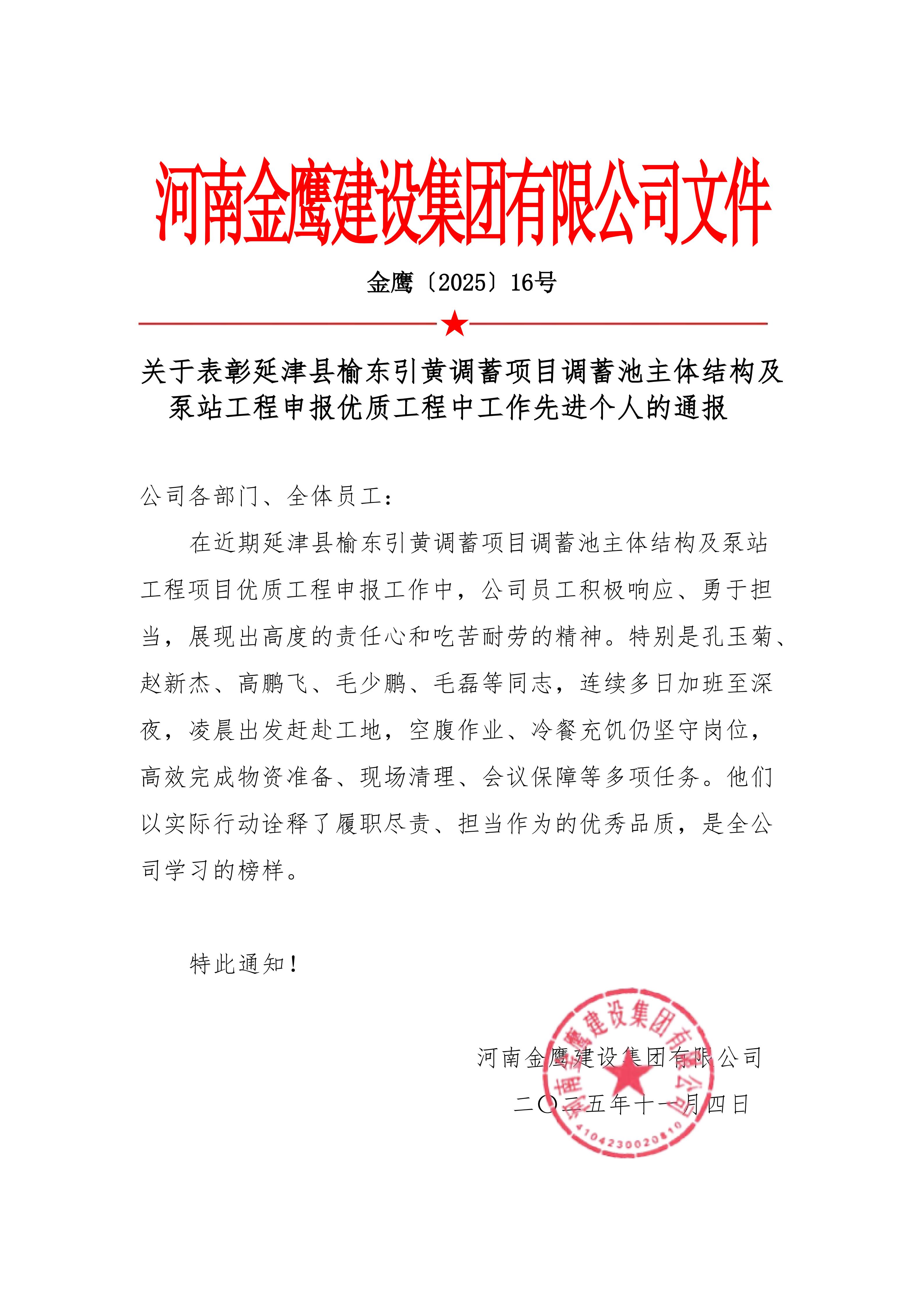 关于表彰延津县榆东引黄调蓄项目调蓄池主体结构及泵站工程申报优质工程中工作先进个人的通报