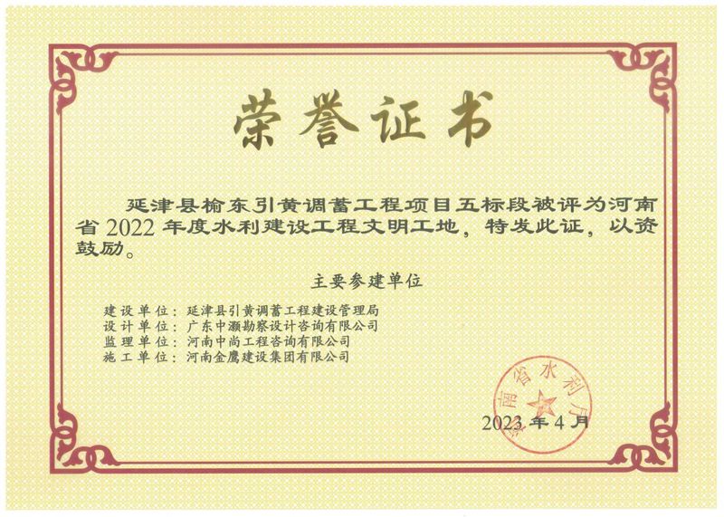 由河南金鹰建设集团有限公司承建的延津县榆东引黄调蓄工程项目调蓄池主体结构及泵站工程(五标段)荣获河南省2022年度水利建设工程文明工地。