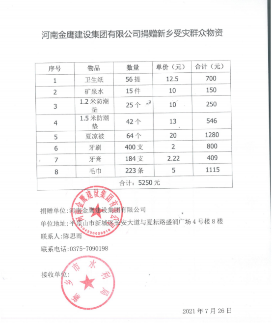 2021年7月26日,河南金鹰建设集团有限公司向新乡市水利局捐赠物资