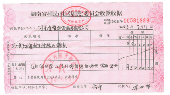 2023年7月11日,河南金鹰建设集团有限公司向湖南沙溪捐赠乡村振兴款。